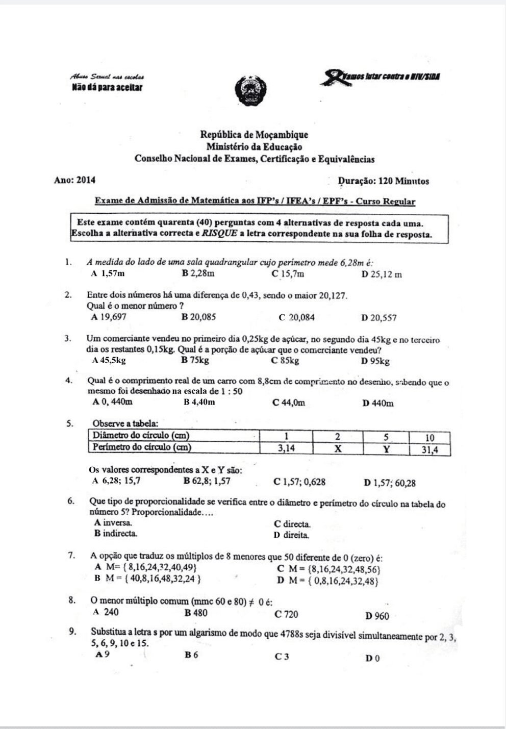 Está disponível para download gratuito o Exame Nacional de Matemática da 12ª Classe – 2ª Época do ano 2014, um dos exames mais importantes do