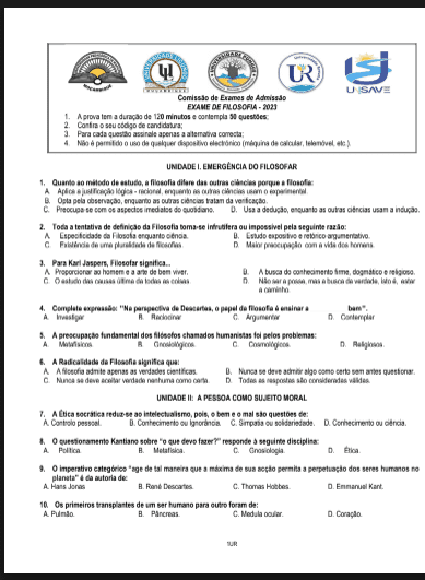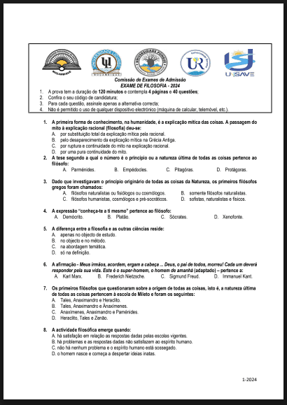 O Exame de Filosofia – 2024 (UP) avalia a capacidade do estudante de refletir criticamente, interpretar textos filosóficos e compreender conceitos fundamentais do pensamento humano.