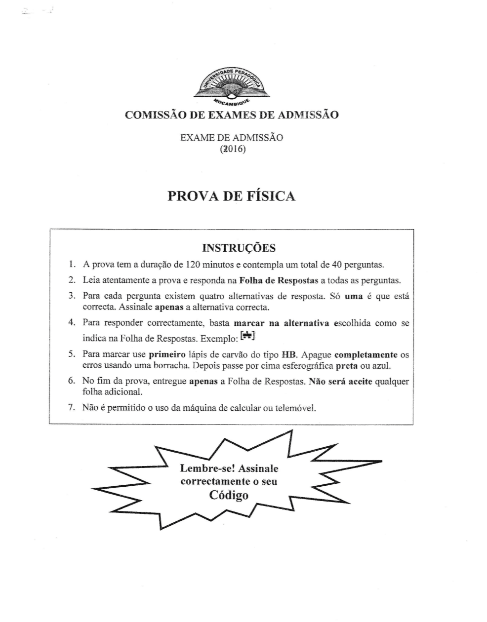 Exame de Física 2014 – Universidade Pedagógica (UP)