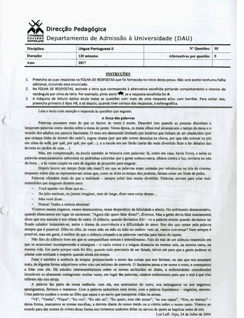 O Exame de Português II 2017 da Universidade Eduardo Mondlane (UEM) representa uma etapa avançada no processo de avaliação dos candidatos ao ensino superior em